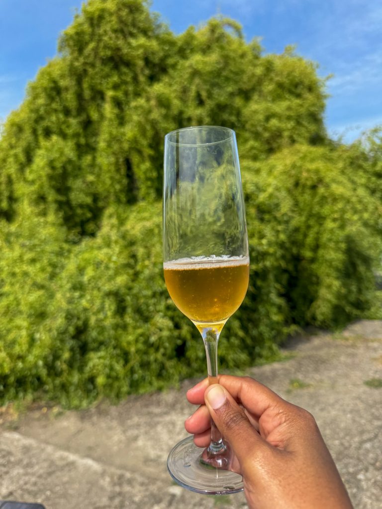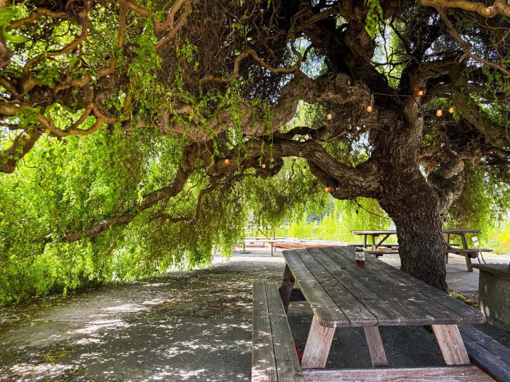 The grounds are gorgeous—open, peaceful, and surrounded by wildflowers and fruit trees. Our favorite discovery was the massive willow tree, which you can actually go inside. Hidden beneath its curtain of leaves is a little seating area with benches. We sat there sipping our mead, completely in our own little world.