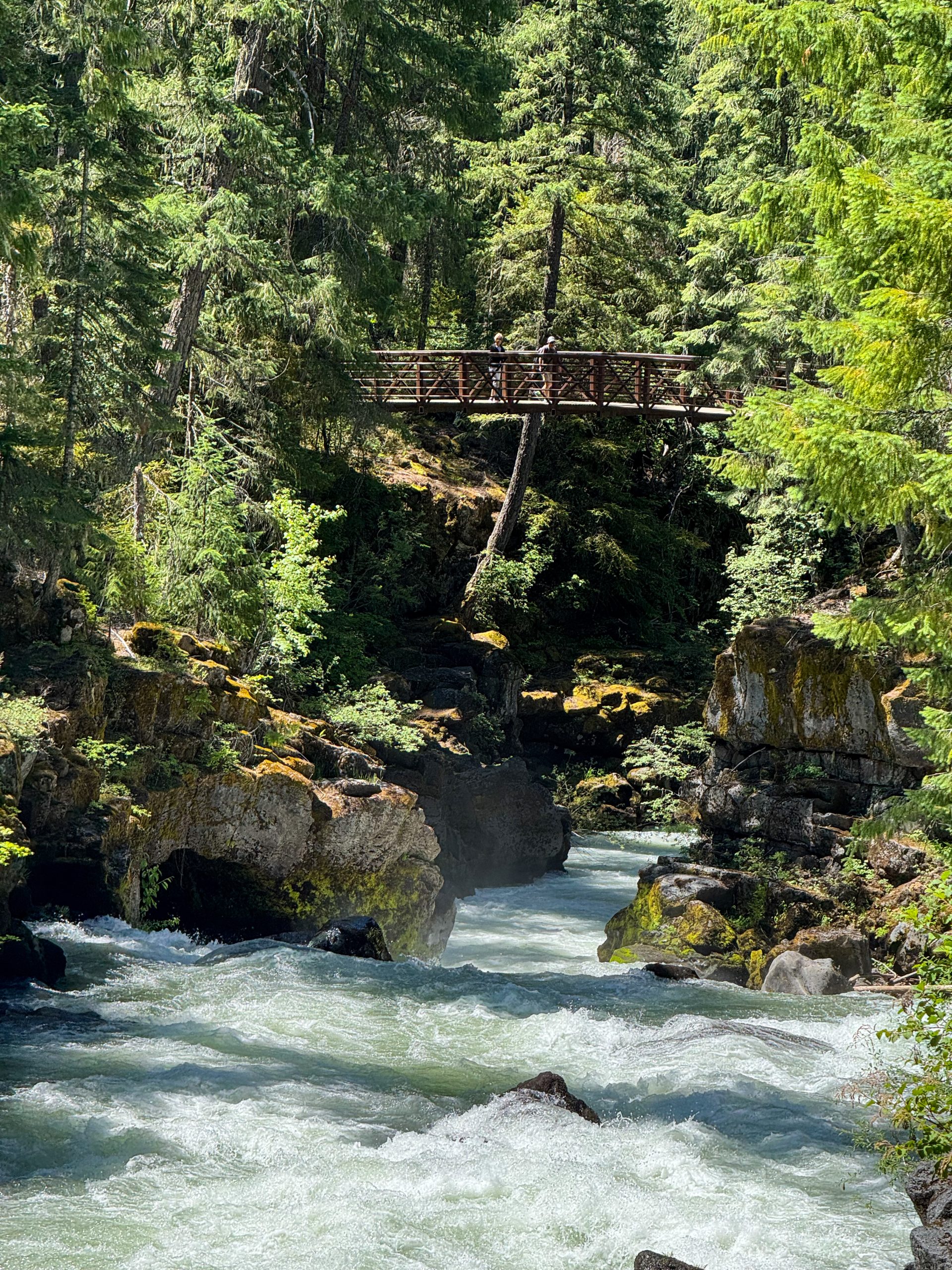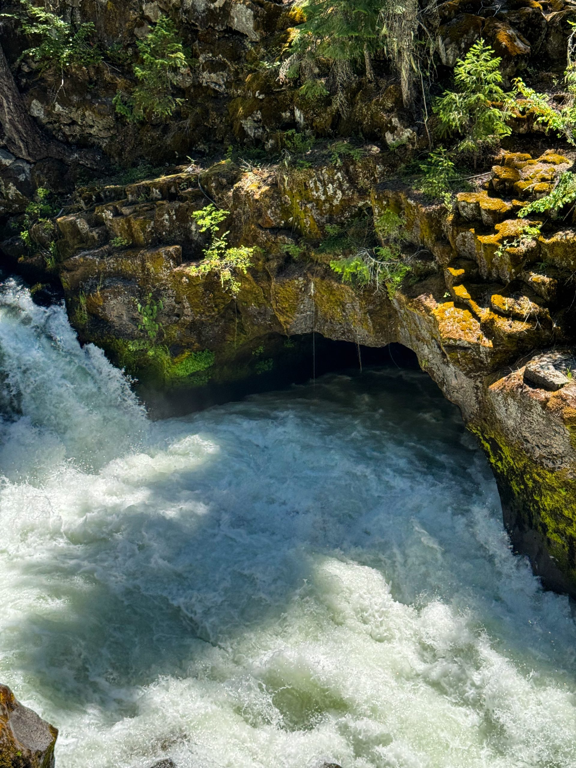 Our first adventure stop of the day was at the Natural Bridge in the tiny town of Prospect. There’s a short, easy trail here that leads to something super cool: the Rogue River literally disappears into a lava tube, travels underground, and then bursts back out on the other side. The water is fast, loud, and so beautiful — we stood there for a while just watching it rush past. It’s one of those stops you might miss if you’re just focused on getting to Crater Lake, but trust me, it’s worth the short detour.