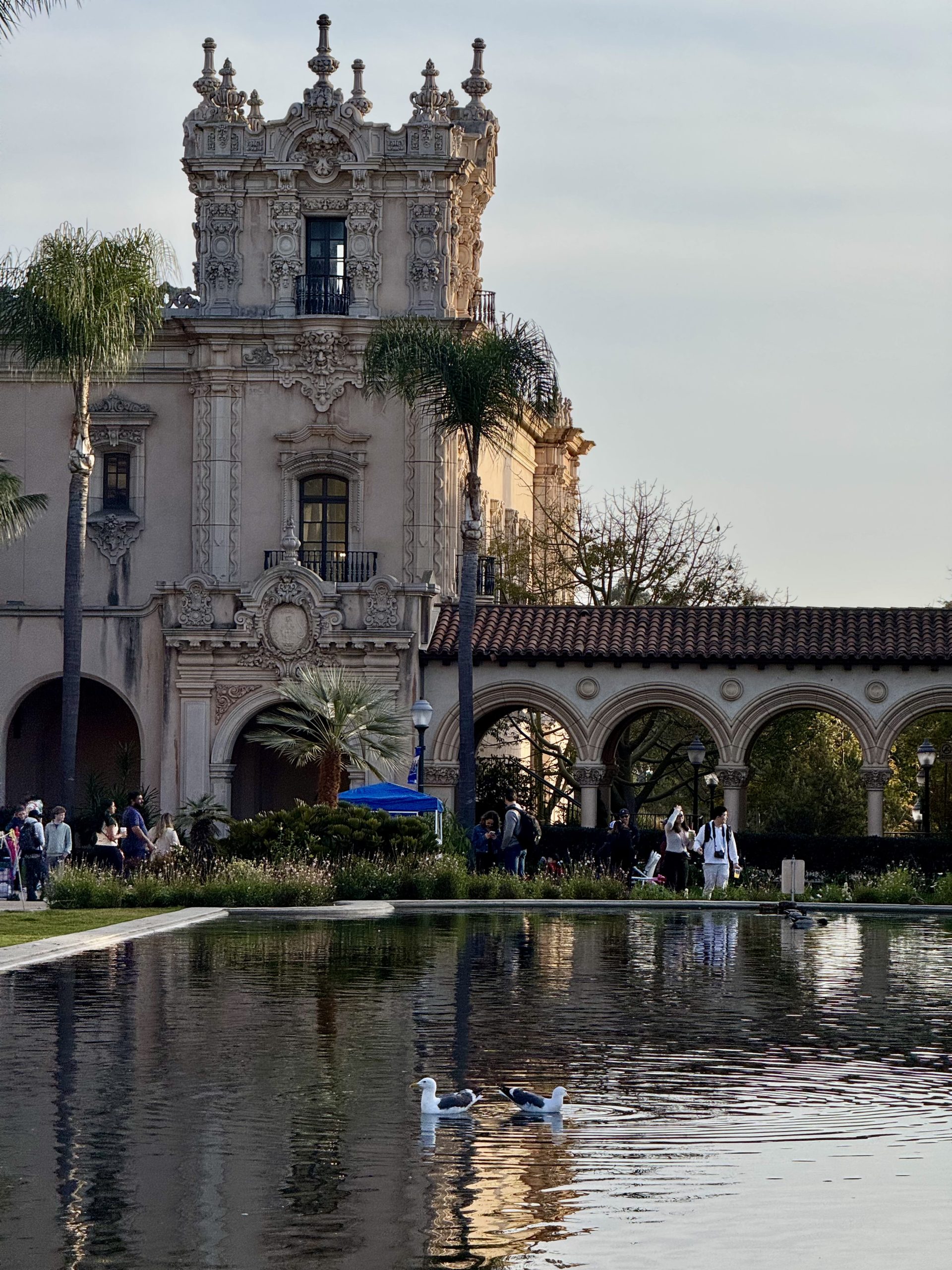 Our final stop for the day was Balboa Park, where we spent some time strolling around and soaking in the scenery. We wandered past the ornate buildings and stopped by the lily pond, which was beautiful. But here’s my tip: walk up and down El Prado, the main pedestrian street that runs through the park. The baroque architecture is absolutely stunning, and one of the popular spots is Casa del Prado—you’ve got to stop and look up, it’s just breathtaking.