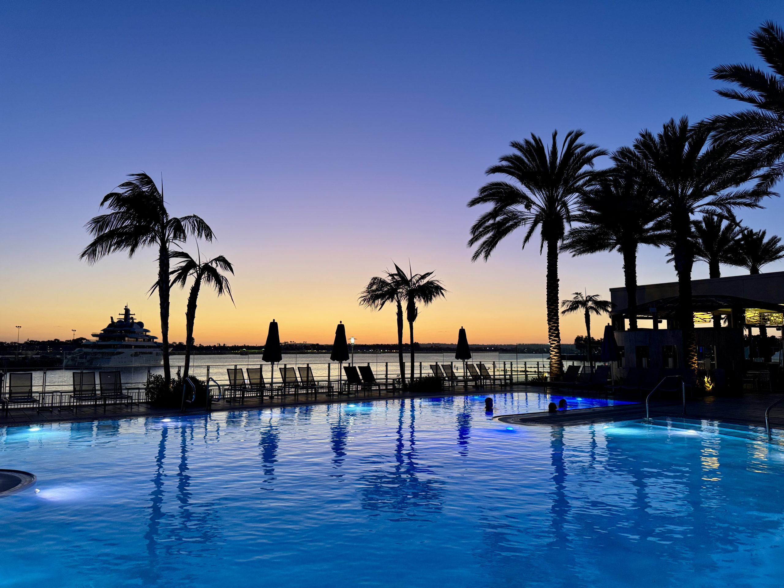 Once we were recharged, we headed out to enjoy the sunset. The hotel had the perfect setup for that—so we grabbed a spot by the hot tub and pool. The view of the sun setting over the bay was breathtaking, and soaking in the hot tub while watching the sky change colors was the perfect way to unwind after a busy day of exploring.