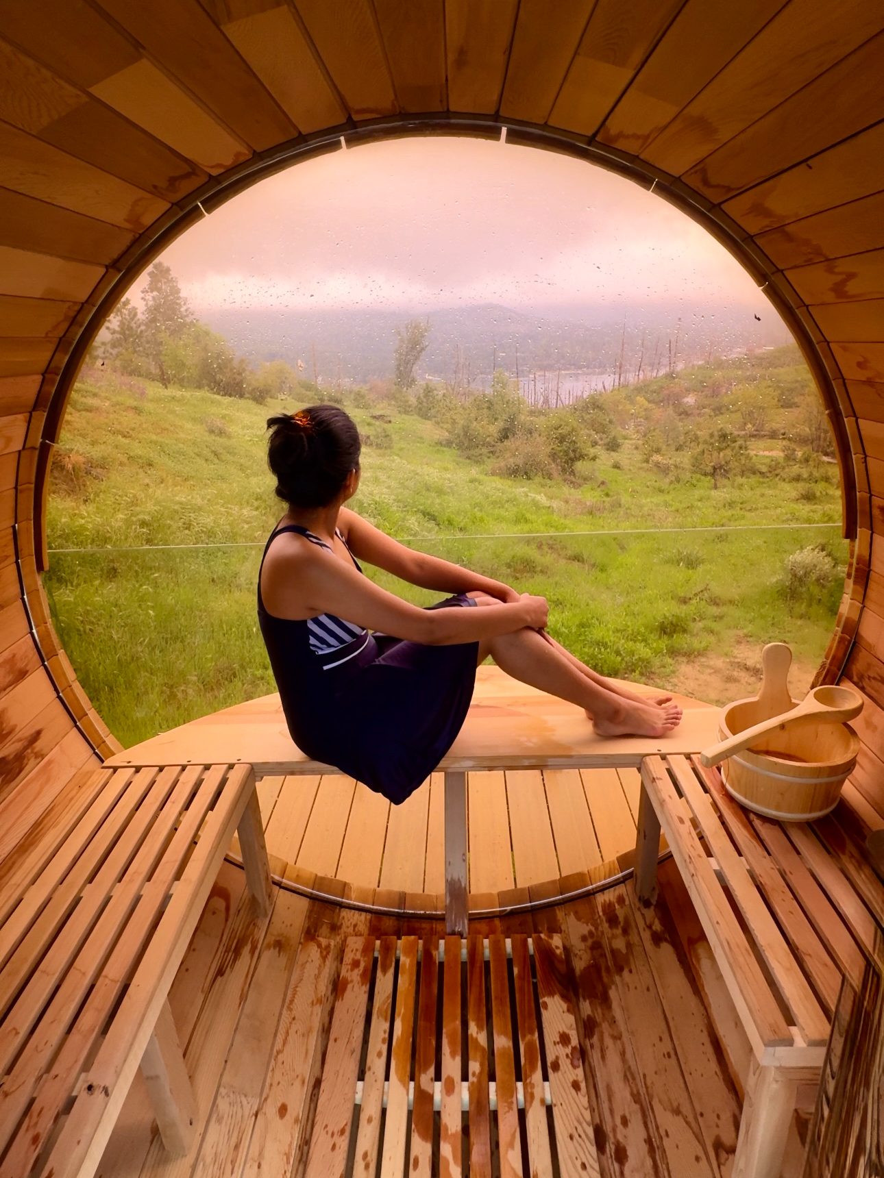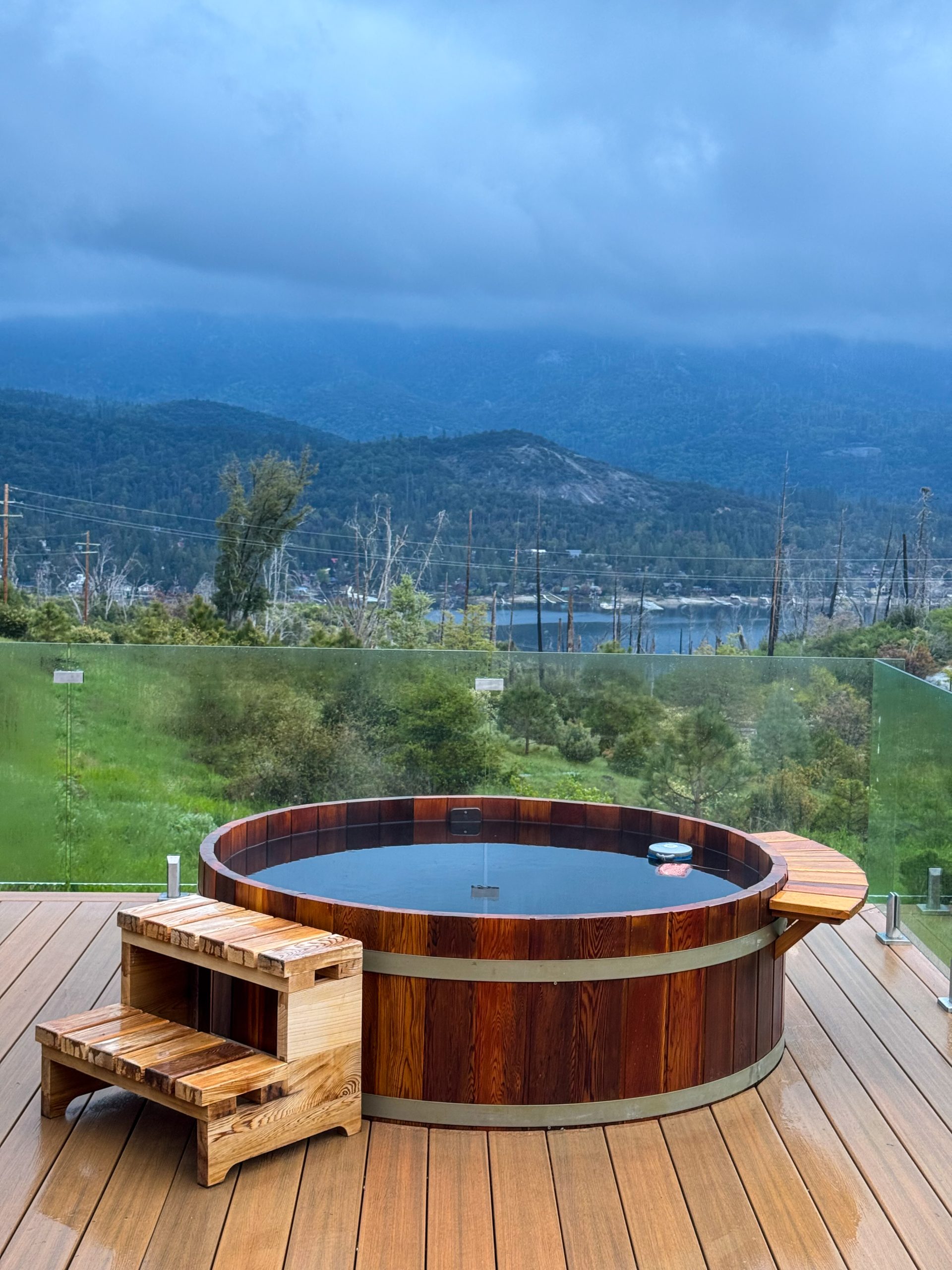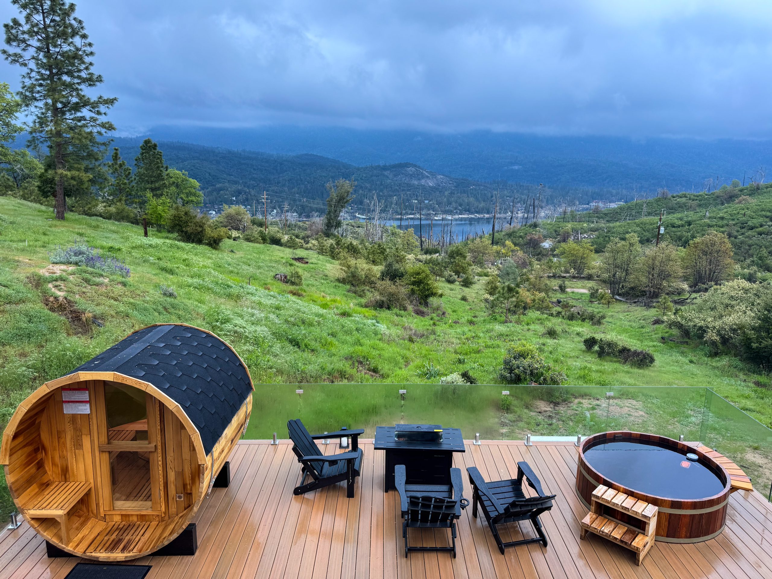 Waking up to mountain and lake views from the bedroom and wellness deck felt surreal. The spa setup—complete with a hot tub and a sauna facing the view—quickly became our morning and evening ritual. Inside, the decor was warm, playful, and cozy, like living in a tiny, well-designed dollhouse. The kitchen and grill setup made it super easy to cook our own meals (grilled tacos were a favorite), and we loved that we could walk straight to Bass Lake from the front door. We even stumbled onto a quiet little trail for a peaceful lakeside walk.